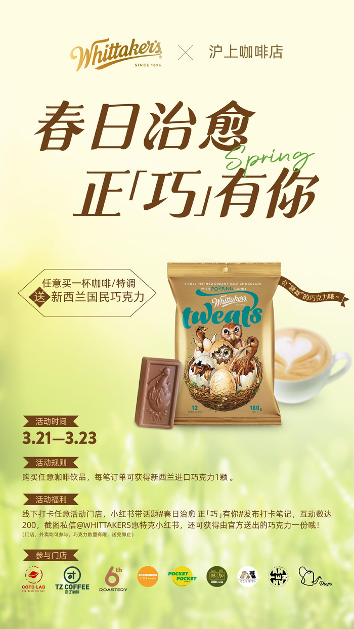 在春分来临之际,3月21日~3月23日打卡沪上热门咖啡店(详情参照春日打卡地图),来店里消费任意咖啡一杯,即可获赠由惠特克巧克力送出的一个惠特克跳跳糖巧克力一块~