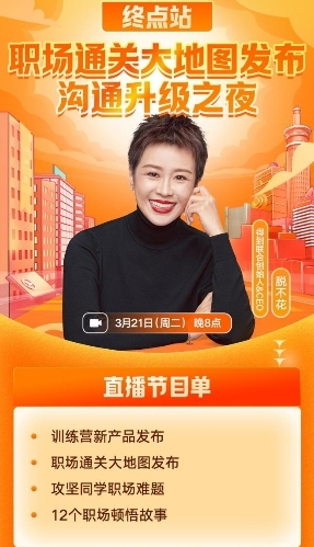 除上述两款产品之外,当晚8点到12点进行的直播中,脱不花还将带来一份覆盖职场人从基层到骨干到高潜再到管理者四个阶段的“职场通关大地图”,帮助职场人洞察晋升路径中的种种问题,掌握关键方法和工具。此外,她还将通过在线答疑方式,为直播间用户解答职场困惑。