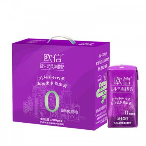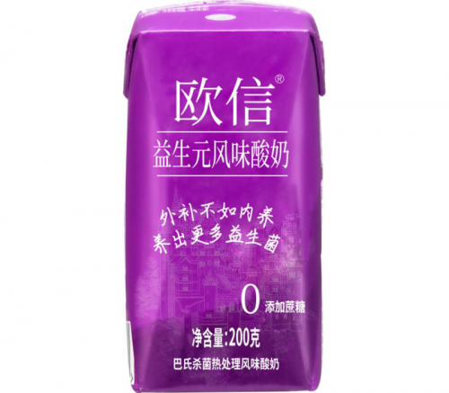 欧信益生元风味酸奶采用专利配方,在配料中添加了婴幼儿奶粉中常见的“益生元”有益成分,添加益生元能够促进益生菌繁殖。其配料中的低聚果糖就是益生元的一种。