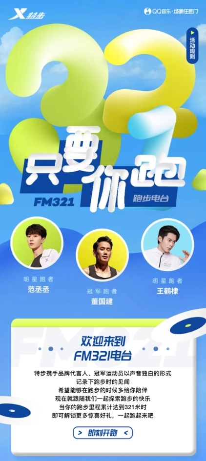 此外,特步联合QQ音乐特别推出「FM321跑步电台」,携手马拉松冠军跑者、以及品牌代言人范丞丞、王鹤棣,用声音独白记录跑步心情,并独家推荐城市跑、海边跑、街头跑等不同场景下的推荐歌单,用独白与音乐陪伴每一位跑者,一起探索跑步的快乐[l1]。