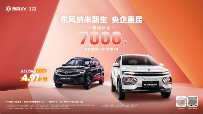 为了回馈用户的支持厚爱,东风纳米在全国范围内推出央企惠民活动,为消费者发放限时购车补贴。据了解,此次活动涵盖东风纳米旗下纳米BOX、EX1 PRO等车型,最高补贴达7000元,2023年3月31日截止。此次活动非常给力还不限地区,惠及全国的消费者,诚意十足,有购车需求的朋友赶紧冲一波。