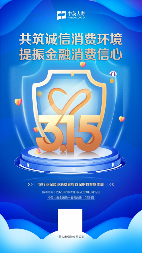 中英人寿上海分公司积极响应监管部门要求,进一步推进金融消费者权益保护工作。中英人寿上海分公司于2023年3月13日至2023年3月19日期间开展“3·15”消费者权益保护教育宣传周活动,切实履行主体责任,在总公司的指导下,全国总、分公司联动开展系列宣传活动。