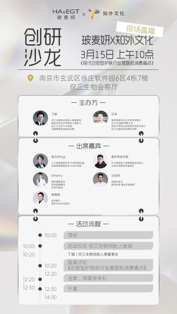 3月15日上午,玻麦妍X知外文化创研沙龙在仅三生物会客厅成功举办。会上,仅三生物科技创始人兼董事长丁总、仅三生物科技首席科学家汪洋博士,与来自知外文化的头部博主、配方师、医学博士,从合成生物技术出发,以“功效型护肤的行业难题及消费痛点”为主题进行了智慧思想的激烈碰撞。