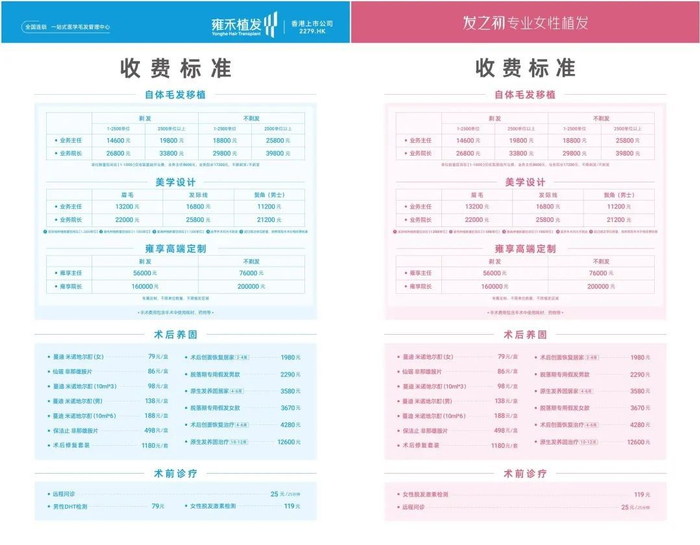 2月14日,毛发医疗上市企业雍禾植发发布消息,旗下植发品牌“雍禾植发”及“发之初”(主打女性植发)院部将同步调整计价方式,在医生分级诊疗体系的基础上以“一口价”的方式确定植发费用。