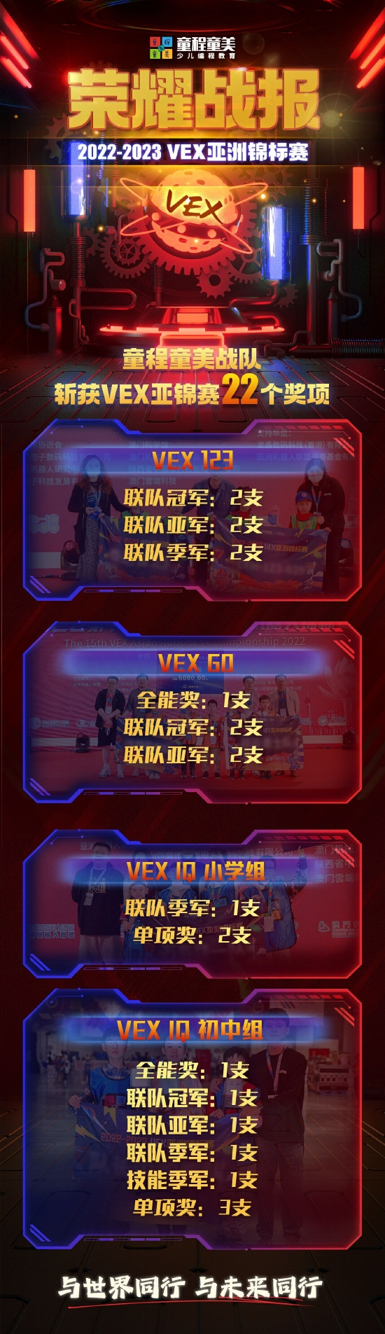 在本场挑战中,来自国内知名少儿编程教育品牌童程童美的战队收获了傲人战绩,一举斩获VEX亚锦赛22个奖项: