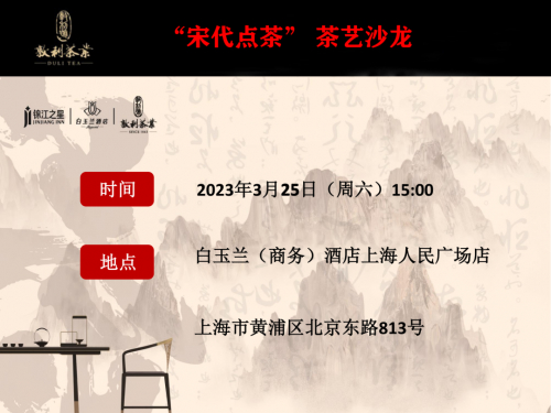 为进一步丰富精神文化,弘扬传统茶文化,白玉兰酒店&敦利号将于2023年3月25日,下午15:00在白玉兰(商务)酒店上海人民广场店举办“精致生活*宋氏美学”中华传统茶文化活动,邀请每一位对宋代点茶文化有兴趣的伙伴前来品鉴茶香之醇厚、体验茶艺之美好!