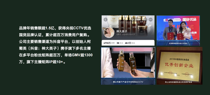 同时,创始人柯菊英其抖音号:神大英子,经抖音平台,携手珂尼娜旗下多名主播,拥有超百万的粉丝矩阵,其单场GMV超1500万,旗下粉丝矩阵超10+,创造出属于国货骄傲的销量战绩。