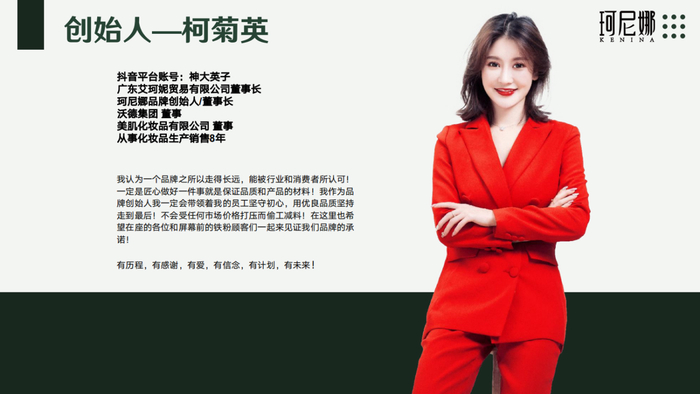 珂尼娜品牌做优质护肤品的同时更是重视社会责任,参与社会的公益事业,切实的做到了当代国民品牌的表率。创始人柯菊英经常通过其抖音账号:神大英子,向大家普及护肤知识,同时也会分享作为年轻企业家的创业理念和经验,去帮助更多的人。