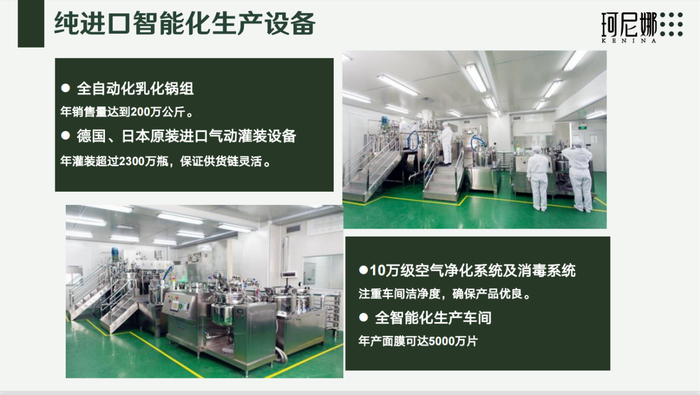珂尼娜品牌隶属于广东艾珂妮贸易有限公司,其成立于2012年,广东艾珂妮贸易有限公司旗下拥有完善的设计开发实验人员和多项护肤品专利开发技术,产品获得质量管理体系双国际认证。珂尼娜旗下的生产车间是一家专业从事化妆品与日化用品 研发、生产、销售、特殊皮肤修护产品定制和售后服务为一体的高新科技企业,公司 荣获欧盟ISO9001、ISO14001双国际良好认证以及美国FDA认证。致力于研发生产全 球领先科技,天然无添加、健康安全的护肤、彩妆、个护,大健康的“妆”、“消”字号类 等高端产品。厂区总面积达20000平,拥有10万级的生产车间,数十条全自动化生产线,6000多款成熟配方,打造全线类的智能制造企业。