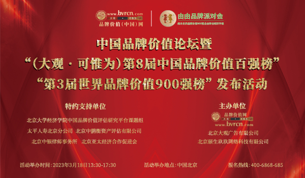 2023年3月18日,中国品牌价值论坛在北京中国太平金融中心盛大举办,来自学界、政界、商界的百余位资深人士深情与会,共同关注中外品牌的发展状况,探讨新时代背景下中国品牌发展的伟大意义。论坛的主题是“彰显中国品牌价值评价标准的国际价值,传播中国品牌价值评价标准的世界通行,加强(大观·可惟为)世界品牌价值900强企业资源服务链接,树立品牌文化自信,铸就国际品牌价值附加”。本次论坛由央视主持人梁慧敏小姐主持。会上,大观·可惟为品牌价值中国网(www.bvrcn.com)CEO、北京大观广告有限公司董事长、北京大学中国品牌价值评估与研究平台秘书长研究员,宋金红女士隆重发布了“(大观·可惟为)第8届中国品牌价值百强榜 ”和“(大观·可惟为)第3届世界品牌价值900强榜”两个重磅榜单。论坛活动全程通过抖音和品牌价值中国网(www.bvrcn.com)的由由品牌派对进行全球直播。
