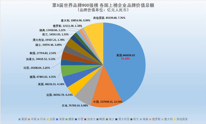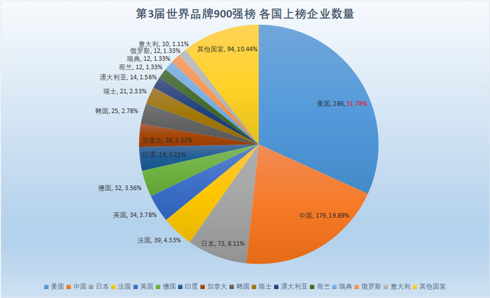 在“(大观·可惟为)第3届世界品牌价值900强”排行榜中,美国品牌总共上榜286家,中国品牌(包含港澳台)总共上榜179家,日本品牌上榜73家,法国品牌39家,英国品牌34家,德国品牌32家,印度品牌29家,加拿大品牌28家,韩国品牌25家,瑞士21家,为上榜品牌数量最多的国家/地区前10名。上榜企业数量上美国遥遥领先。结合各国上榜企业数量和品牌价值总额来看,美国在数量上占比接近三分之一,而在品牌价值总额的占比超过了五分之二,由此可见美国企业的品牌不仅在数量上更占优势,在品牌价值上的优势更加明显。
