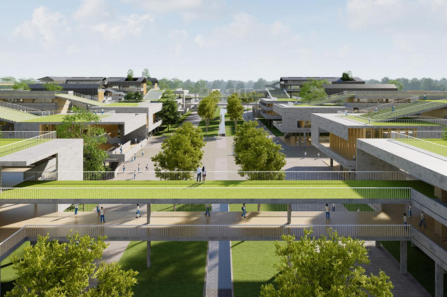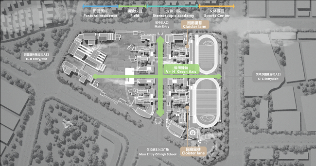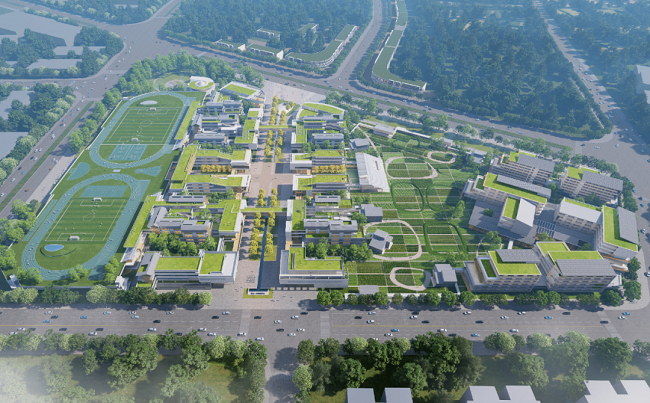 佛山一中顺德学校,城市、生态与建筑之间达到了高度融合,利用南北轴打通住宅与商业的城市视线通廊,东西轴连接城市开放空间、教学区与生活区,以开放到私密的原则依序而落。整体建筑高度控制在24m以内,采用“纵横绿轴”布局,串联生态、文化、体育三大共享中心。