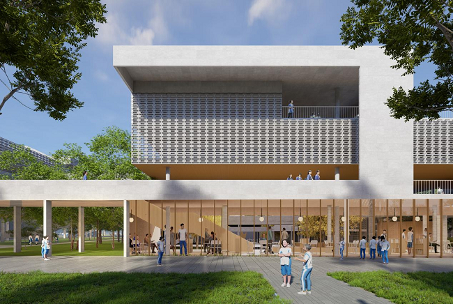 AG汇创从湾区教育类建筑设计及落地经验出发,以适应未来教育为起点,引入国际先进办学理念,充分融入岭南在地文化与周边生态记忆,以“现代阡陌书院”定义整个项目的设计。以研究性为前提,通过联结历史脉络、环境记忆、建筑构成,创造田塘村与新城市相应对,与文化脉络相传承的岭南现代校园。