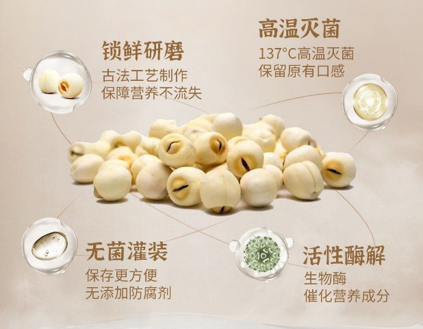在制作工艺方面,馋大狮莲子汁采用锁鲜研磨工艺,用生物酶对其进行活性酶解,既能保证莲子营养不流失,又能催化其中的营养成分。再经过137°高温灭菌、无菌灌装等处理流程,保留了莲子原有的清甜口感。