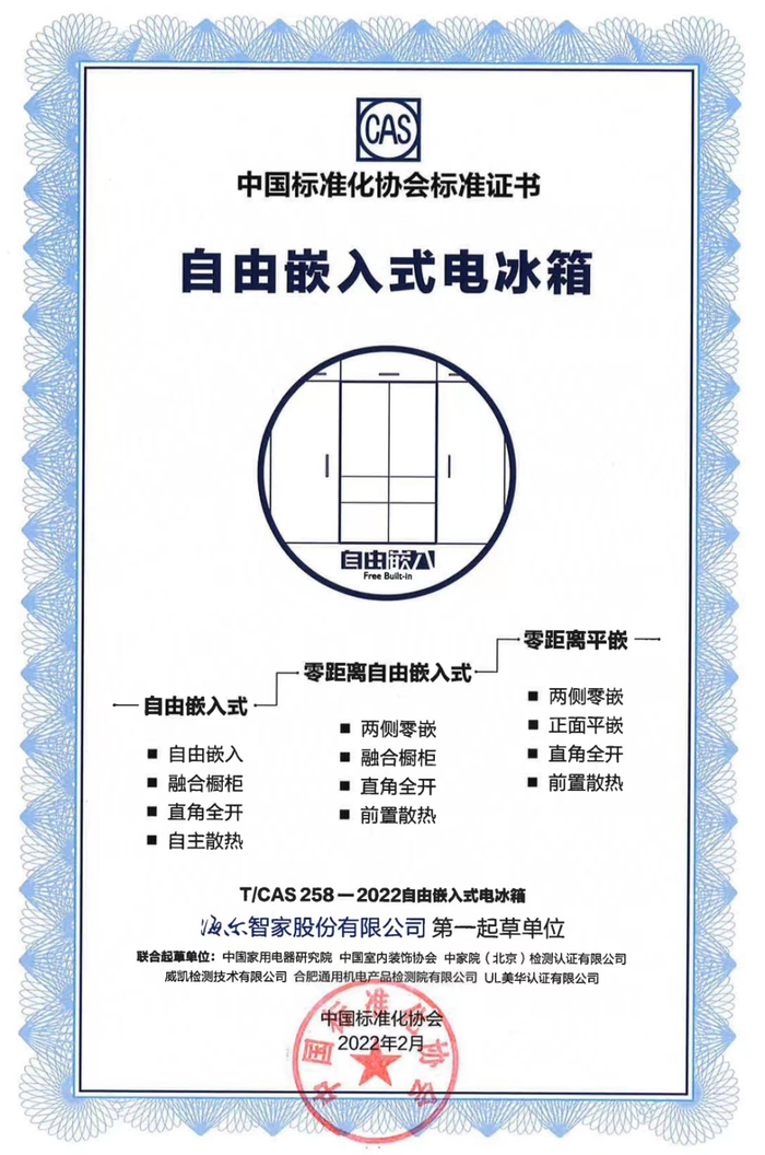 该标准依据冰箱嵌入橱柜效果,将自由嵌入式电冰箱分为三个等级:自由嵌入式、零距离自由嵌入式、零距离平嵌 。海尔智家股份有限公司作为该标准的第一起草单位,联合国内外6大权威机构共同起草,针对每一个等级都树立了明确的行业标准,并获中国标准化协会的官方认证。《自由嵌入式电冰箱》的发布引领未来家居一体行业趋势,为行业发展指明方向。