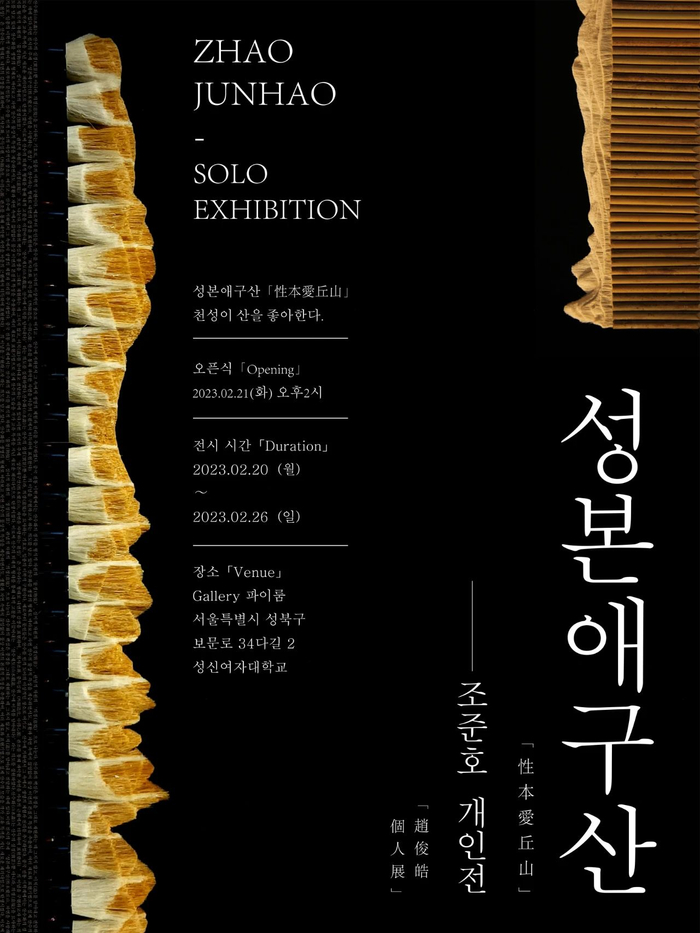 「성본애구산性本愛丘山」赵俊皓雕塑个展于2023年2月20日在韩国首尔πROOM空间正式展出,此次展览共计展出艺术家赵俊皓在韩国期间所创作的多件山水主题雕塑装置系列作品。出席开幕式嘉宾:韩国传媒艺术协会理事、影视传媒协会理事、首尔美术作品审查委员会委员、诚信女子大学程廷柱教授,国际美术交流协会BESETO艺术节理事、皇冠海泰汉江雕塑项目运营委员长、诚信女子大学金成馥教授,威尼斯双年展韩国馆策展人、中国昊美术馆尹在甲馆长,韩国诚信女子大学张旭西教授,韩国诚信女子大学赵慧玎教授。
