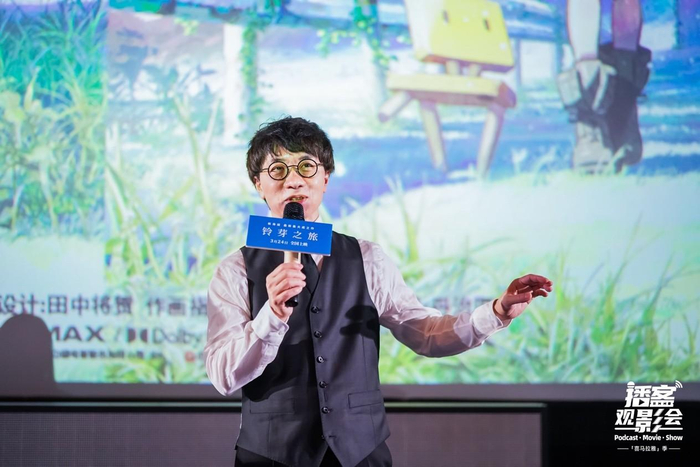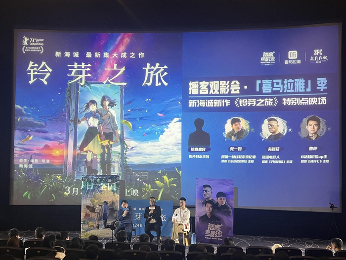 在观影会现场,新海诚亲自演绎为《铃芽之旅》片段配音,喜马拉雅三位播客主则在观影结束后在现场围绕电影开启播客对谈。播客主“梵一如”是播客《井户端会议》《东亚观察局》主理人,原为《第一财经》驻东京记者;播客主“关雅荻”是资深电影人,也是播客《开放对话》主理人;播客主“曹柠”是播客《咸柠七》主理人。三人的播客节目在喜马拉雅深受欢迎。此次对谈也将以播客节目的形式上线喜马拉雅,错过现场可登录喜马拉雅搜索“播客观影会”收听。