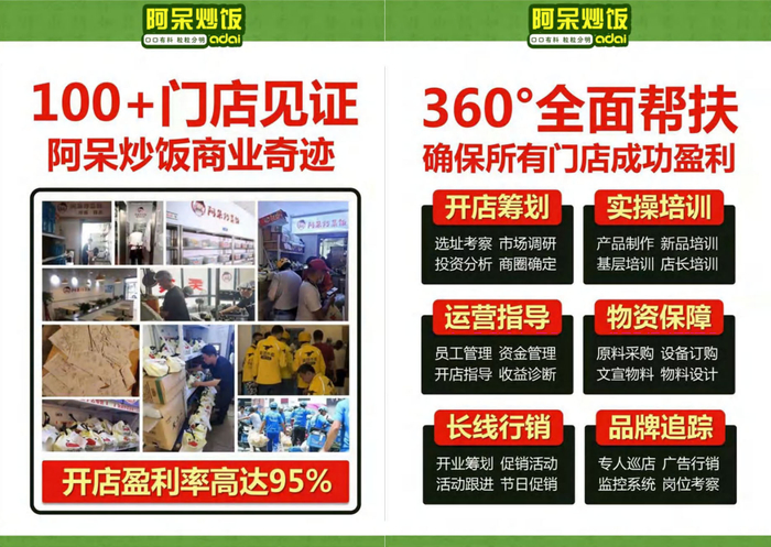 时至今日,标榜着“”低门槛、易操作、高人气“的网红餐饮项目,加盟后才发现生意惨淡入不敷出,数十万投资打水漂的案例比比皆是。阿呆炒饭从开店筹划、实操培训、运营指导、物质保障、长线行销、品牌追踪六大方面360°全面帮扶,确保所有门店成功盈利,真正做到“小投资、大生意”。