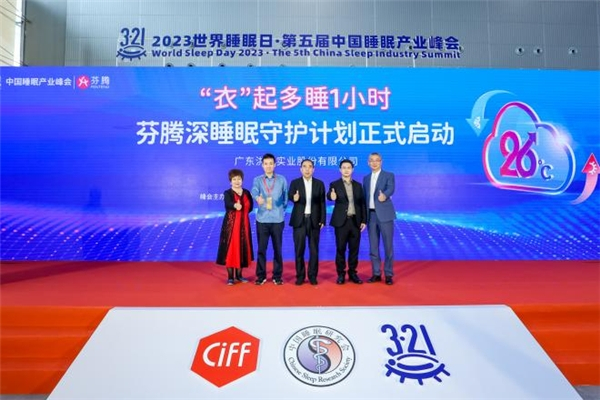 2023芬腾深睡眠守护计划也在本次发布会上宣布启动。中国睡眠研究会秘书长左和鸣、中国睡眠研究会睡眠产业与转化工作委员会秘书长潘继红、中国睡眠研究会睡眠产业与转化工作委员会总干事蔡畅、广东洪兴实业股份有限公司董事长郭梧文和广州洪兴服饰有限公司总经理严广征一起上台,共同进行启动仪式。未来,芬腾品牌将致力于让更多专业舒适科技睡衣走进中国千家万户,守护国人深睡眠。