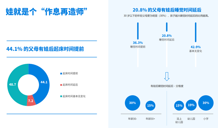 调查显示,近七成父母有娃后更注重规律作息。但57.1%的父母睡觉时间点受到影响,51.3%的父母起床时间点受到影响,42.9%的父母夜醒次数增加,71.4%的父母午睡习惯变化。其中,20.8%的父母有娃后睡觉时间延后,44.1%的父母有娃后起床时间提前。哄娃睡觉、陪娃玩,帮娃成长促学习,买菜做饭让娃吃饱喝好,送娃上学……成为父母有娃后晚睡早起的重要原因。而在忙碌和疲惫之后,父母们对养生、健康的重视也在加强。