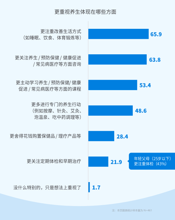 报告显示,六成的父母有娃后比有娃前更重视养生。对养生的重视主要体现在更注重改善生活方式(如睡眠、饮食、锻炼等)和更关注养生健康相关资讯,比例均超六成。尽管有旺盛的“养生欲”,但转化到实际行动上着实不易。受限于时间、精力、金钱等因素,超过半数父母不会在有娃后更多进行专门的养生活动(51.4%)。