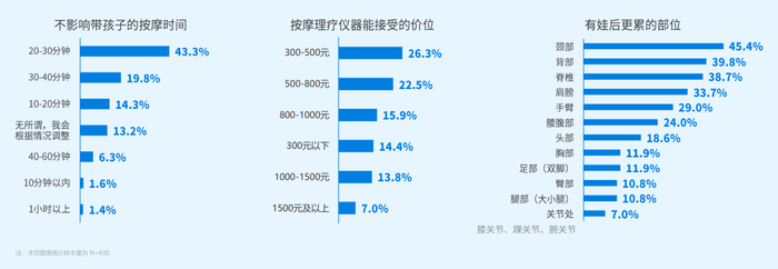 调查显示,三成以上的受众更愿意在泡脚、养生食疗、泡澡、体育锻炼、按摩理疗(31.4%)等养生服务/产品上花钱。但省时、省钱、管用是中青年父母消费时关注的重点,以按摩理疗产品为例,他们的主要需求是:按摩时间20-30分钟(不耽误陪娃),价格300-500元(不妨碍养娃),针对肩颈、脊背(能精准缓解带娃劳损)为宜。