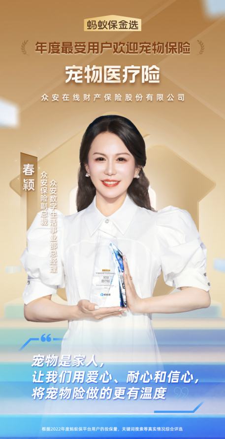 3月21日,「金选2022年度最受欢迎保险」榜单发布,该榜单主要根据平台用户的投保量、关键词搜索等真实情况进行综合评选。众安保险旗下三款明星产品:宠物医疗险、手机碎屏险、无忧保综合意外险连揽三项大奖,涵盖了宠物健康、财产、意外多个领域,成为此次民选榜单最大赢家。