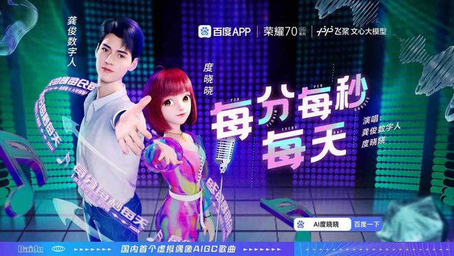 同样借助百度AIGC进行品牌内容创意突破的,还有荣耀。去年,荣耀70系列新品上市之际就与百度营销合作,作为荣耀70系列全球代言人,同时又是百度App代言人的龚俊,成为双方探索创新营销的主角。借此,基于百度飞桨文心大模型AI共创,共同打造国内首支虚拟偶像AIGC单曲《每分每秒每天》,由数字人龚俊和度晓晓联合倾情演绎。这首歌的作词、编曲均由AI“操刀”,将荣耀70系列「焦点在我」标语、新机功能和卖点自然融入到歌词和MV中。同时,还打造了龚俊数字人AI定制语音包,为荣耀二创MV提供充足素材,实现新品热度引爆、热度持续、品牌破圈三大营销效果。