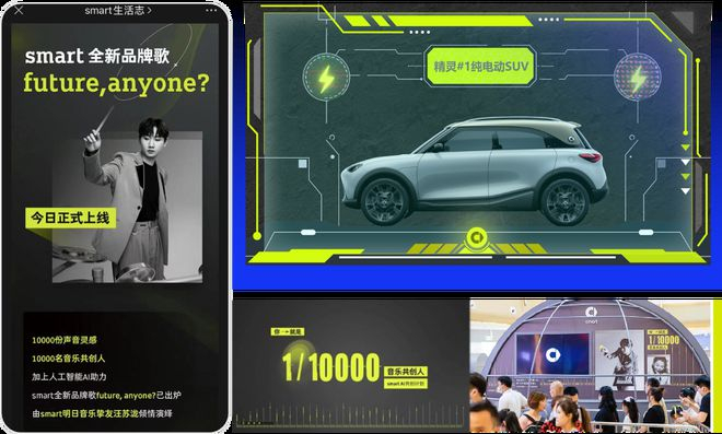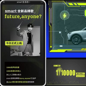 在音乐共创中,smart邀请广大用户一起加入“音乐共创实验”,利用百度飞桨深度学习平台+AI语音合成技术,以284份自然之声、195份人间烟火气作为创意灵感,将10000名普通用户的声音碎片,通过百度AI智能编曲,汪苏泷填词、演唱,共创一首数字艺术歌曲《无你不明天future,anyone》,最终成为smart全新品牌歌曲。AI技术的加持,让“品牌音乐”这一原本常规的营销动作,变成了每个人都能参与的声音互动,圆了所有参与者一个“作曲梦”。不仅维护了老客群——唤起老车主的归属感和血统认可;还开拓了新市场——向广大热爱艺术、有品位的年轻人传递品牌理念,成功带动品牌APP下载量突破10万,首周预售订单超10000辆。