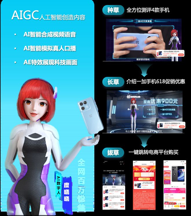 一加手机为了在618大促中实现Ace系列新品“出道即顶流”,联手百度营销锁定“用户决策深度依赖内容测评”的习惯,打通从种草-长草-拔草的全链路。通过数字人度晓晓AIGC能力生产评测视频,从性能配置到充电续航,从游戏体验到外观设计等多角度进行全方位测评;同时,通过对多款机型的对比测评,让各款手机卖点清晰明了,全方位种草用户不同需求;随后,度晓晓介绍了618促销优惠,并作为百家号作者分发内容,同时挂载商品组件,引导用户一键跳转电商平台下单,撬动用户购买意愿,形成内容营销转化闭环。