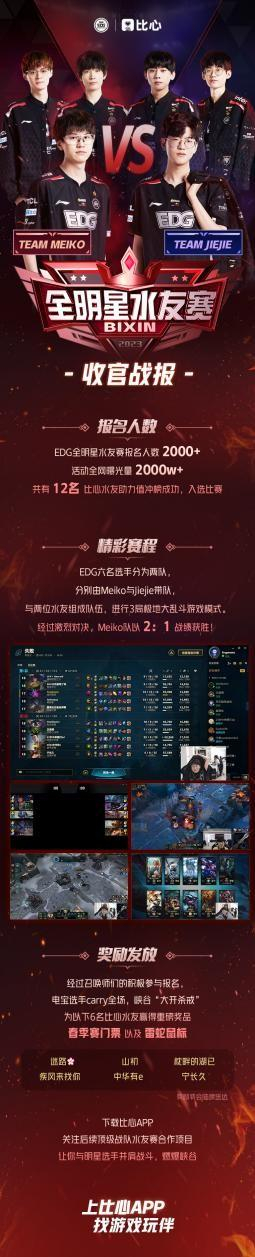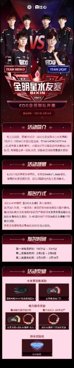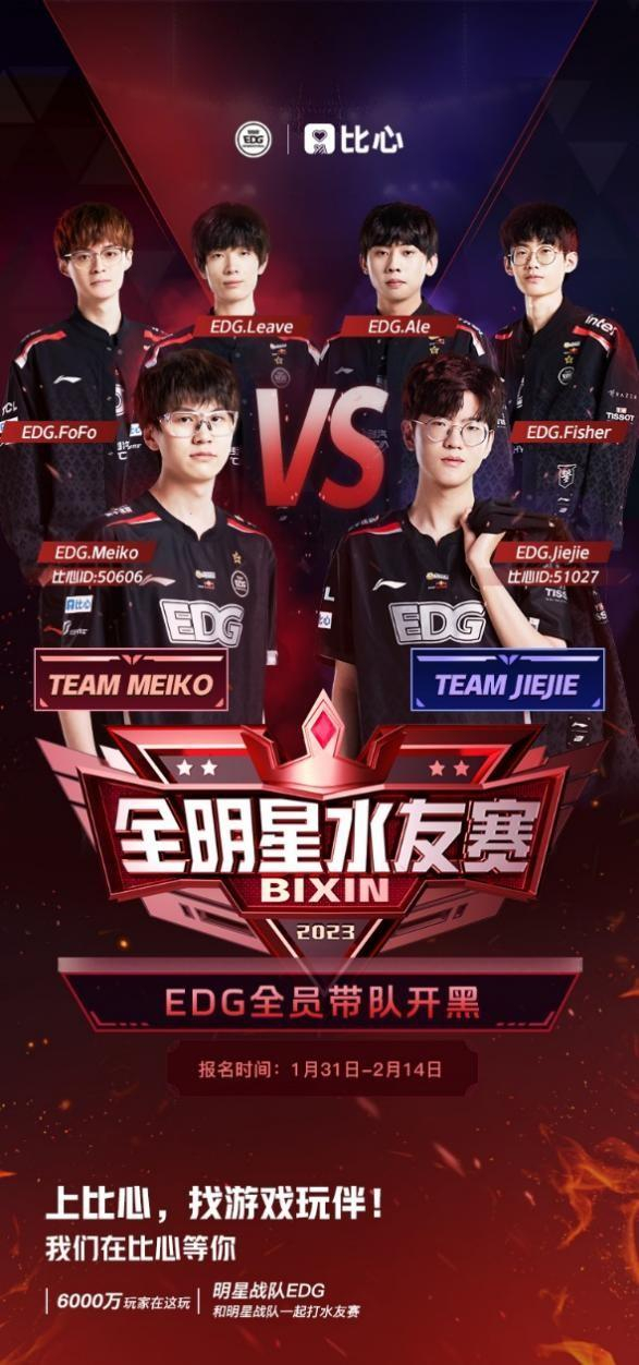 据悉,本次全明星水友赛共设3局,EDG首发6人参赛,水友们通过比拼好友助力值获得水友赛资格。正式比赛中,每队阵容依然是3队员+2水友VS 3队员+2水友,采用峡谷随机大乱斗模式参赛,水友们则通过比心APP独家渠道报名。其中Meiko和Jiejie分别作为队长,带队PK,呼唤全网水友来比心水友赛一起开黑。