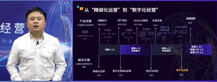 会上,诸葛智能创始人&CEO 孔淼发表主题演讲,分享对数字化经营的最新思考与落地产品方案。诸葛智能数据产品经理高策、诸葛智能产品总监徐晨、诸葛智能CTO文革针对诸葛智能从数据采集、分析到营销方面的全域闭环产品及能力进行深入解读,并重磅推出诸葛CDP 2.0、诸葛io 3.0、诸葛CEP 2.0三大产品升级。