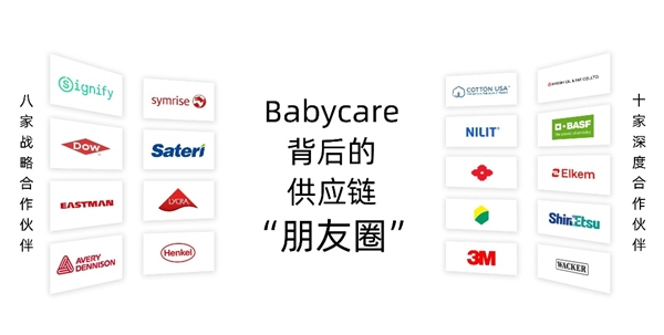 这一点在尿裤类目体现的尤为突出:Babycare婴童尿裤获得市场成功的一个关键背景是,Babycare不拘泥在一城一池,而是选择链接全球先进供应商。据了解,仅在原材料供应商方面,Babycare目前就已与徳之馨、赛得利、莱卡、汉高、昕诺飞、陶氏化学、伊士曼、艾利丹尼森共计8家国际领先企业达成紧密的战略合作关系,覆盖纤维、粘合剂、光源产品等多个领域。这一全球“朋友圈”阵容堪称豪华:战略合作的8家企业来自美国、德国、荷兰等4个国家,企业平均成立年限超过100年,预估年销售收入总合超7000亿元人民币。除此之外,Babycare还与3M、巴斯夫等10家国际企业或机构达成深度合作。链接全球资源叠加内生工业设计能力,这为Babycare在纸尿裤及其它品类的颠覆式创新提供了坚实的供应链底盘。