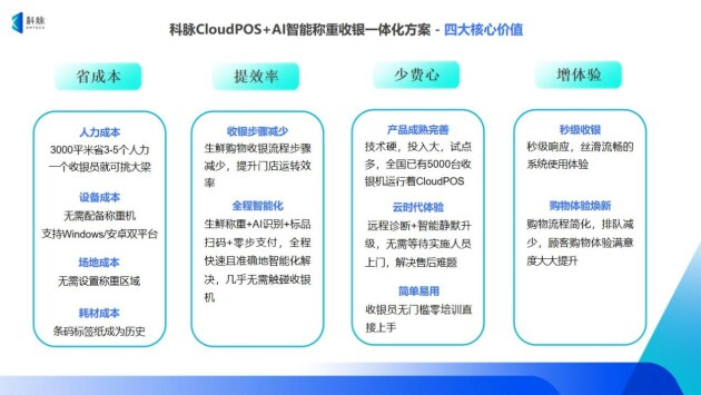 科脉CloudPOS+AI智能称重收银一体化方案对生鲜门店来说,有着四个最质朴但却最核心的价值:省成本、提效率、少费心、增体验。