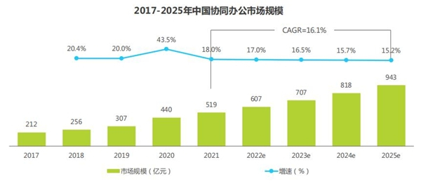 艾瑞咨询发布的《2023年中国协同办公行业研究报告》数据显示,2022年协同办公市场规模在607亿元,增速为17%。亿欧智库发布的《2022年中国数字化办公市场研究报告》统计,2022年OA市场增速为20%。