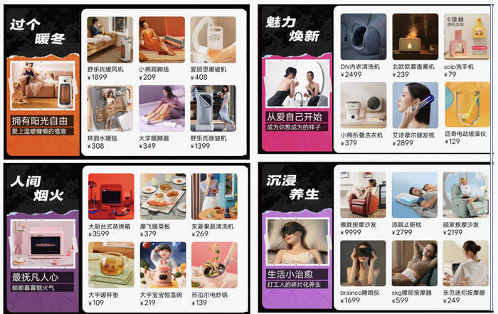 小家电细分市场爆款频出,垂类长尾品类在消费复苏时期崭露头角,去年同比销售增速超过100%。细分趋势品类吸引力主要体现在三个方面:一是相较传统大类市场而言渗透率偏低,竞争相对缓和,更精细的客户洞察将带来效果更好的差异化产品,电烤盘、按摩器等新品类拥有比例低于20%,未来市场渗透空间更大;二是长尾趋势品类单价较低,具备一定的快消品性质,易受内容营销、概念宣传等“种草”影响而产生冲动消费,新趋势品类需求爆量潜力大,爆点内容的精准投放将带来更好的爆品打造效果;三是Z世代逐步成为家电消费主力,这些年轻客群具有超前的消费观念,追求“新、奇、特”的产品,展现自我精致及个性化的生活;比如火焰香薰机、智能洗手机、按摩腰带、电动搓澡仪等高颜小众化产品极大满足了消费者的情绪价值,受到年轻消费者热捧。