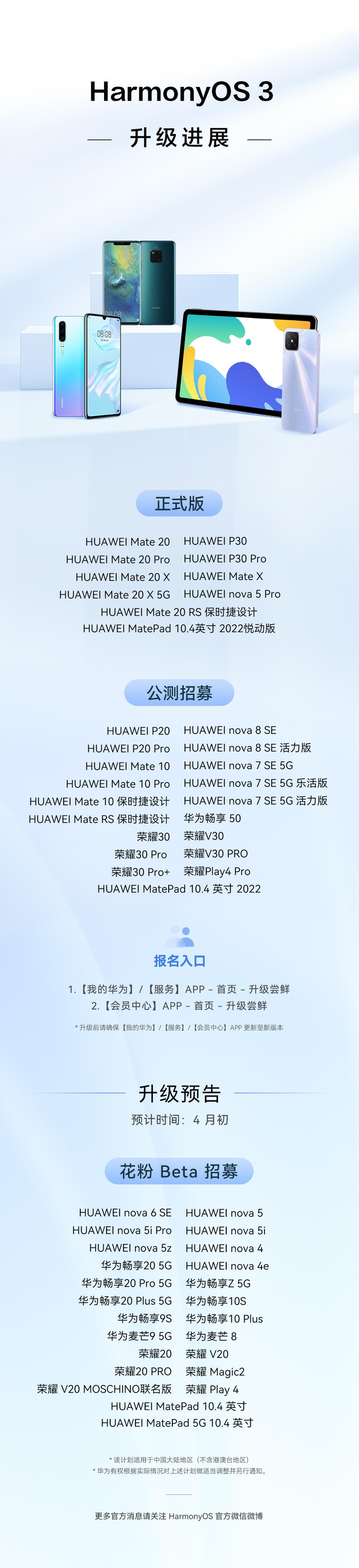 2023年3月23日,华为春季旗舰新品发布会即将举办,其中包括P60、Mate X3在内的一系列重磅新品将会集中亮相,而就在发布会召开前夕,华为官方又带来了HarmonyOS 3最新升级进展的好消息,宣布对Mate 20、P30、nova 5 Pro等10款设备开启正式版升级,对Mate 10、P20等19款设备启动公测招募,同时官方海报还披露了一大波机型的升级预告,让用户期待值一步拉满。