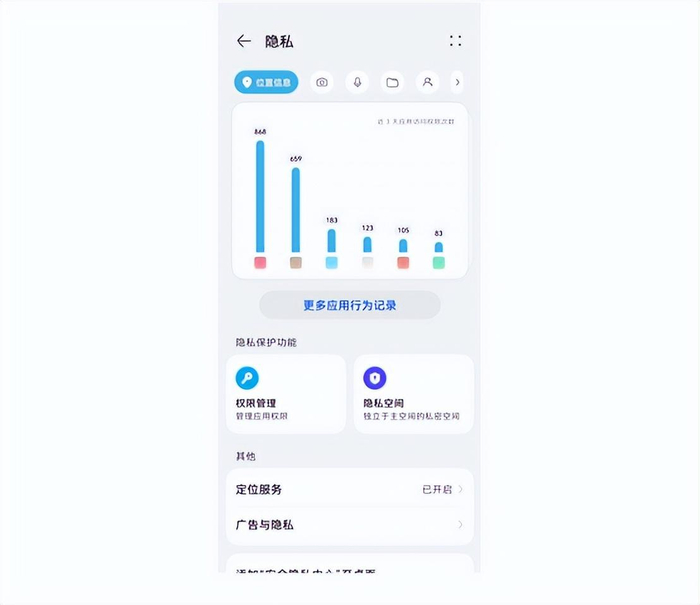 隐私中心则是查看所有应用行为的总看板,在这里你可以清晰看到所有应用访问相机、麦克风、位置、存储、通讯录等敏感信息的记录,手机里所有APP访问权限的内容、时间以及次数都将被展示出来,行为轨迹一览无遗,再也不怕APP在背后搞“小动作”。