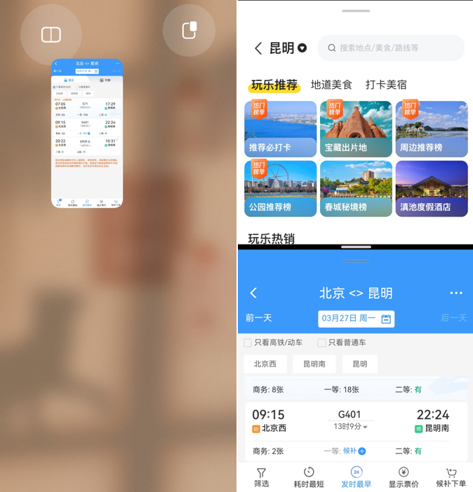 如果你近期计划出游,就可以使用智慧多窗一步分屏,一边做攻略一边查询高铁、民宿等信息,同屏操作更高效。操作方法也很简单,无需依靠侧边栏开启分屏的方式,你只需在应用全屏显示时,从屏幕底部向左上方滑动,即可进入待分屏状态,然后打开桌面另一支持分屏的应用,就能完成分屏。