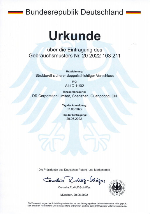 但DR所要守护的真爱,是爱了,就要爱一辈子。为了诠释这种坚定不移的爱。DR设计出稳定不易脱落的锁扣,并成功申请了德国与中国的两项新型专利,为消费者提供全方位保障。
