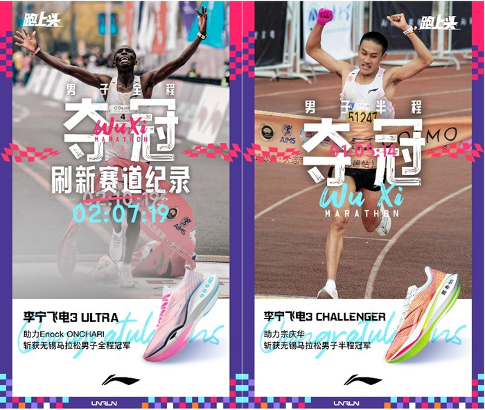 3月19日上午,世界田联金标赛事2023COLMO无锡马拉松圆满落下帷幕,李宁顶级竞速跑鞋飞电3 ULTRA助力签约运动员埃诺克(Enock ONCHARI)以2小时7分19秒打破赛会记录并获得男子组全程冠军;同时,李宁飞电3 CHALLENGER助力签约运动员宗庆华勇夺男子半程比赛冠军。
