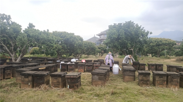 穿过荔枝树掩映的乡间小道,“嗡嗡嗡”的声音越来越响,再向前多走几步,蜂场便映入眼帘。地面上,100多个蜂箱摆放得井然有序,蜜蜂在空中乱舞,蜂农正忙着取蜜;临时搭建的简易居所里,开着盖子的暖瓶正冒着热气,旁边的杯子里装着刚刚冲好的蜂蜜水,供路人品尝,空气中溢出甜甜的蜜香。