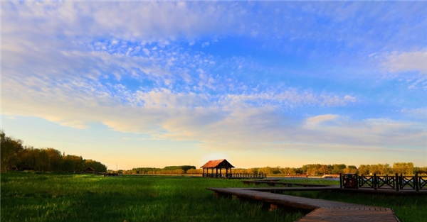 作品简介:成片的芦苇,曲折的木栈道,一座临水的茅草屋,构成了“网红”打卡景点。