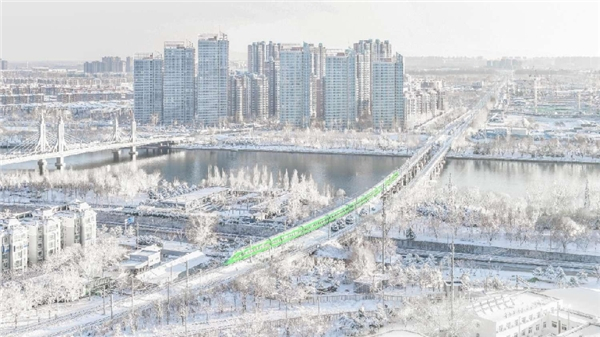 作品简介:大雪过后运河岸边,茫茫雪海中绿色动车穿行而过,满载着希望走向春天。