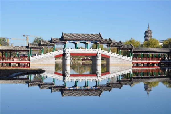 作品简介:跨湖廊桥为近景,远处是闻名遐迩的燃灯佛舍利塔。平静清澈的湖面上倒映着它们美丽的身影。