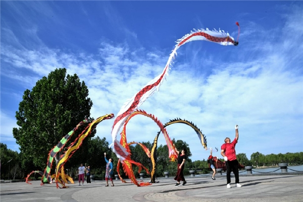 作品简介:在蓝天白云#x200e;衬托下,晨练的人们“在撒欢”,分享群龙飞舞的欢乐。