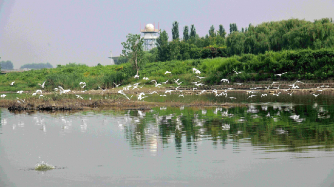 作品简介:甘棠船闸南口,运河西岸近百只白鹭飞到浅滩玩耍捕鱼。