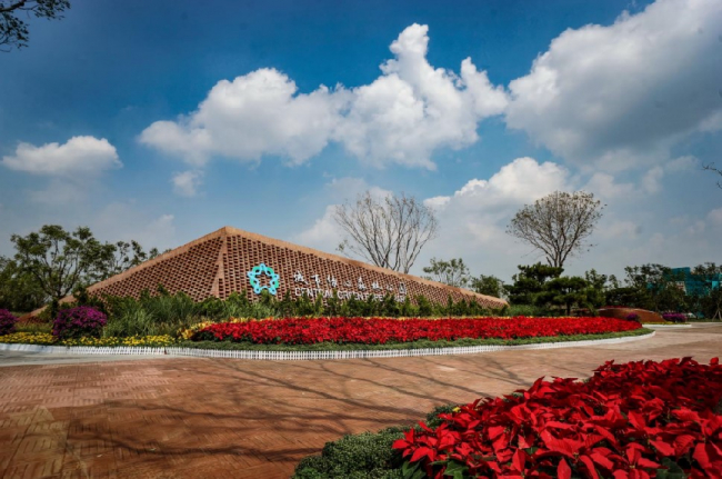 作品简介:红砖广场,紧邻绿心路,以“青夏槐荫”为设计主题。运用红砖、绿树、草坪等现代简洁的设计元素,与原东亚铝业厂区遗址风貌巧妙结合,塑造了园林景观与老工业厂区和谐共生的森林门区。