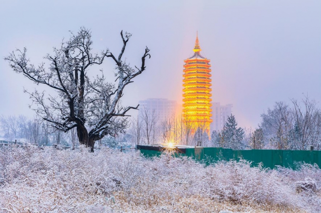 作品简介:雪后清晨,灯光映射下的燃灯塔与古树。