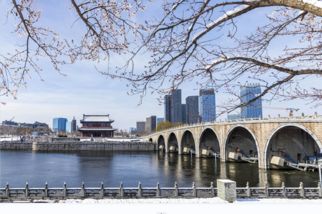 作品简介:2021年3月的春花巧遇春雪,让古色古香的大光楼掩映在春花和春雪之间,分外靓丽。